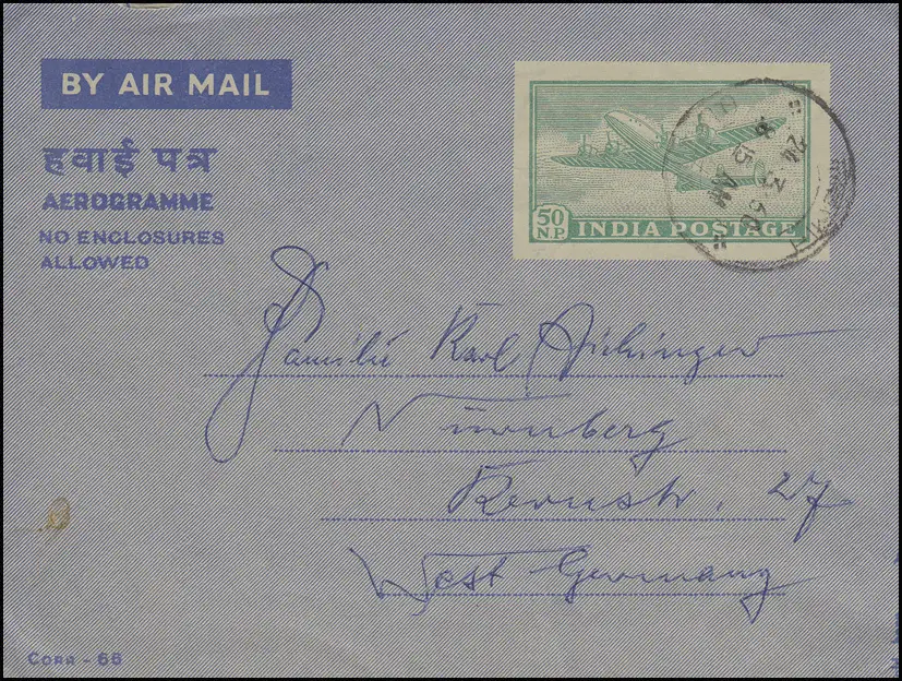 Inde Aérogramme hélices 50 N.P. vert le 24.3.60 vers Nuremberg