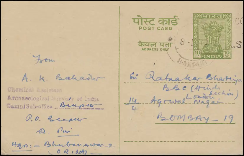 Inde Carte postale / Postcard 10 P. Louvain / Lions vert, BANPUR vers BOMBAY 1957