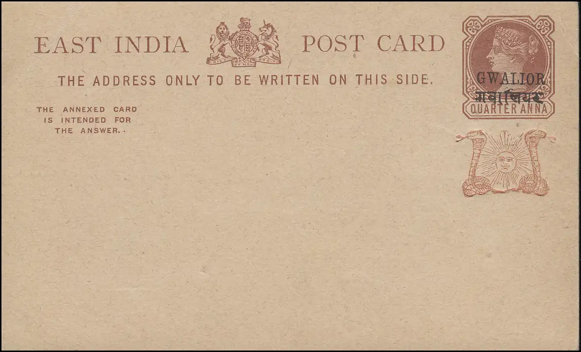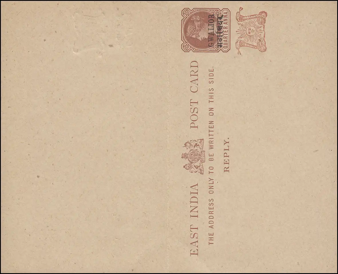 Inde orientale carte postale marron QUARTER ANNA avec impression noire GWALIOR, non utilisé