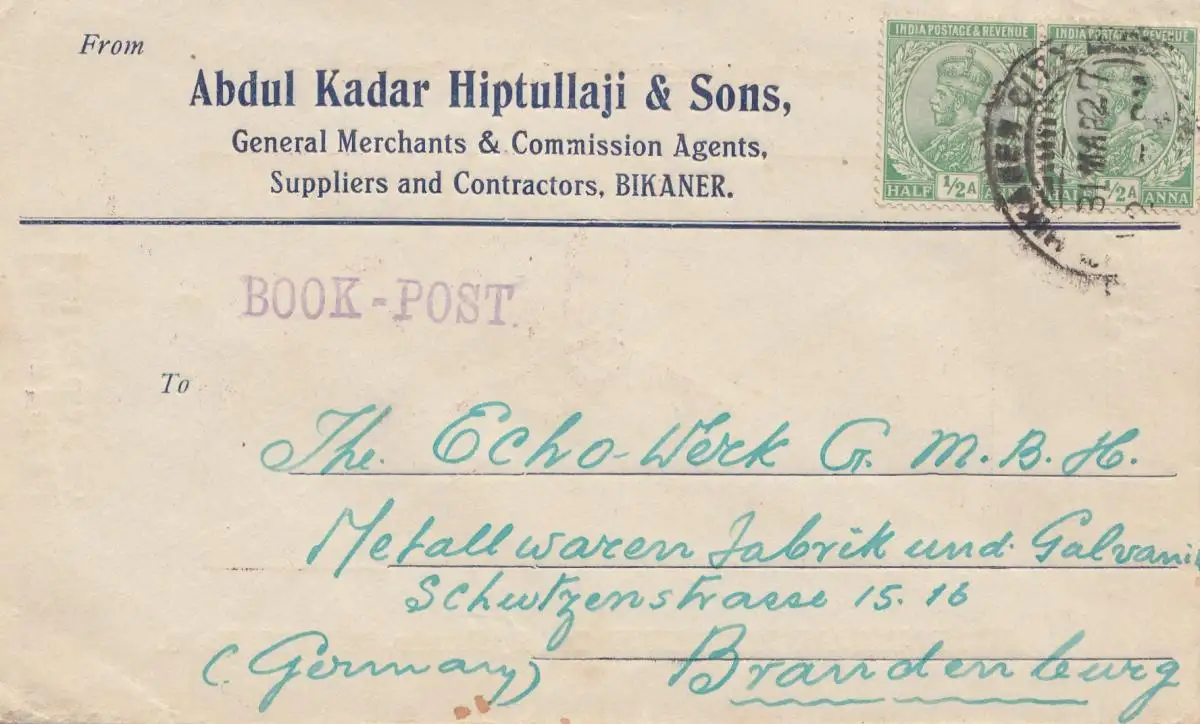 India: 1922 Bikaner to Brandenburg/Germany, Book-post, Pakistan Perfumery