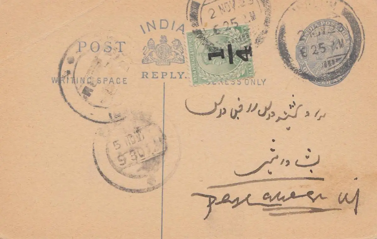 India: 1923: post card - reply cart