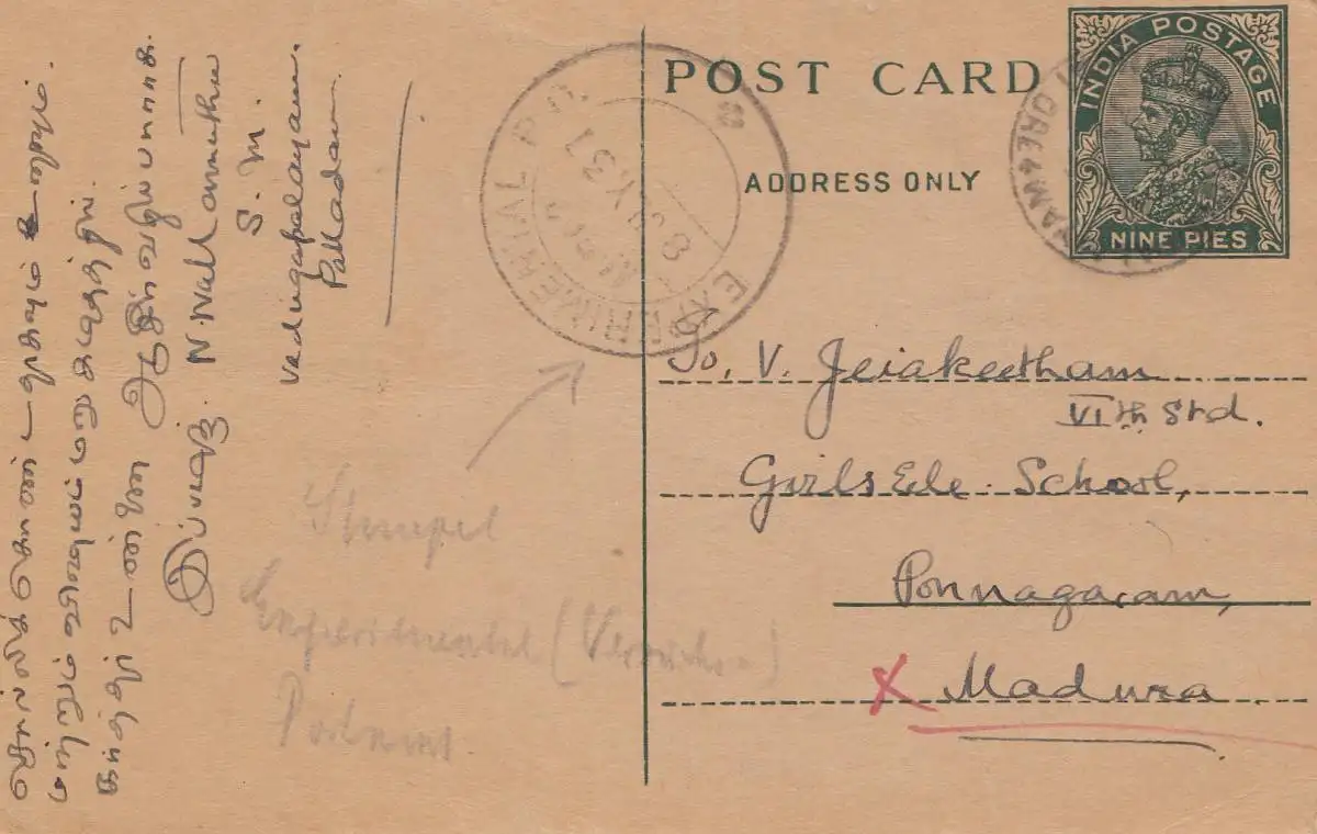 India: 1931: post card to Pannagaram