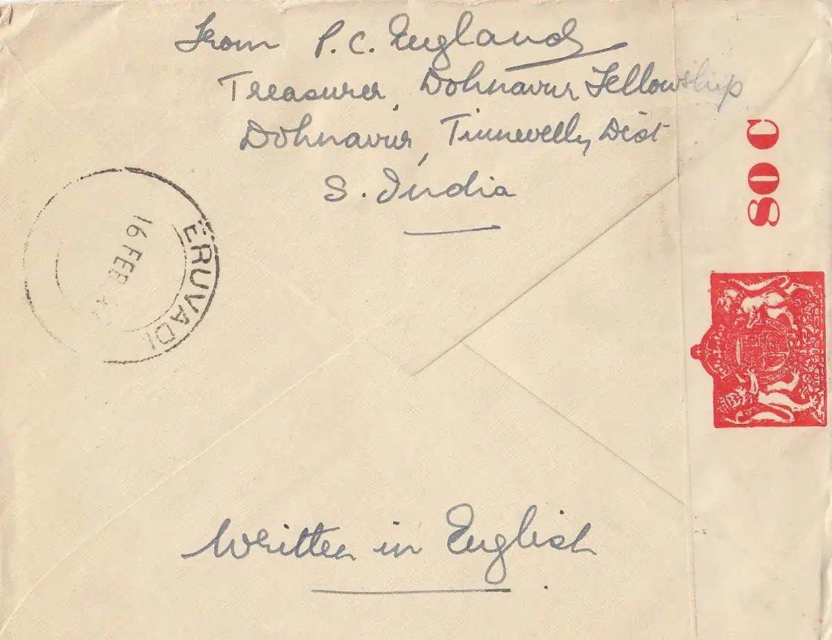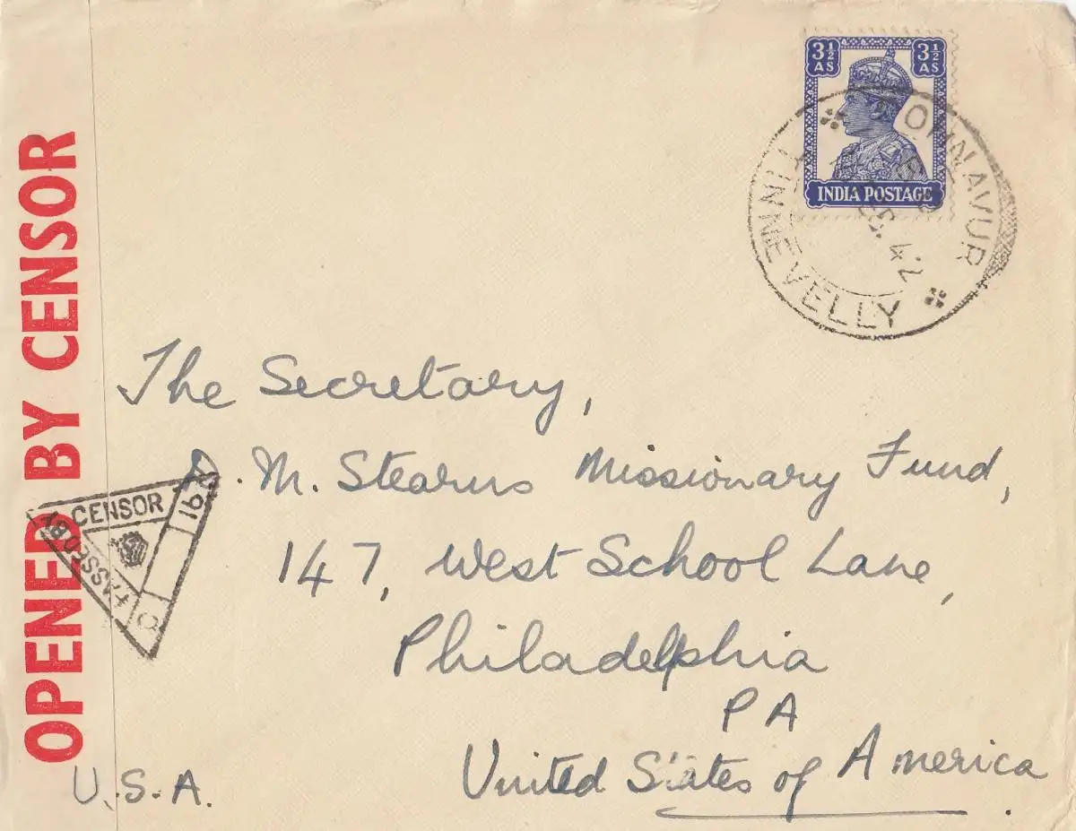 India: 1942: letter Ohnavur to Philadephia, cessor