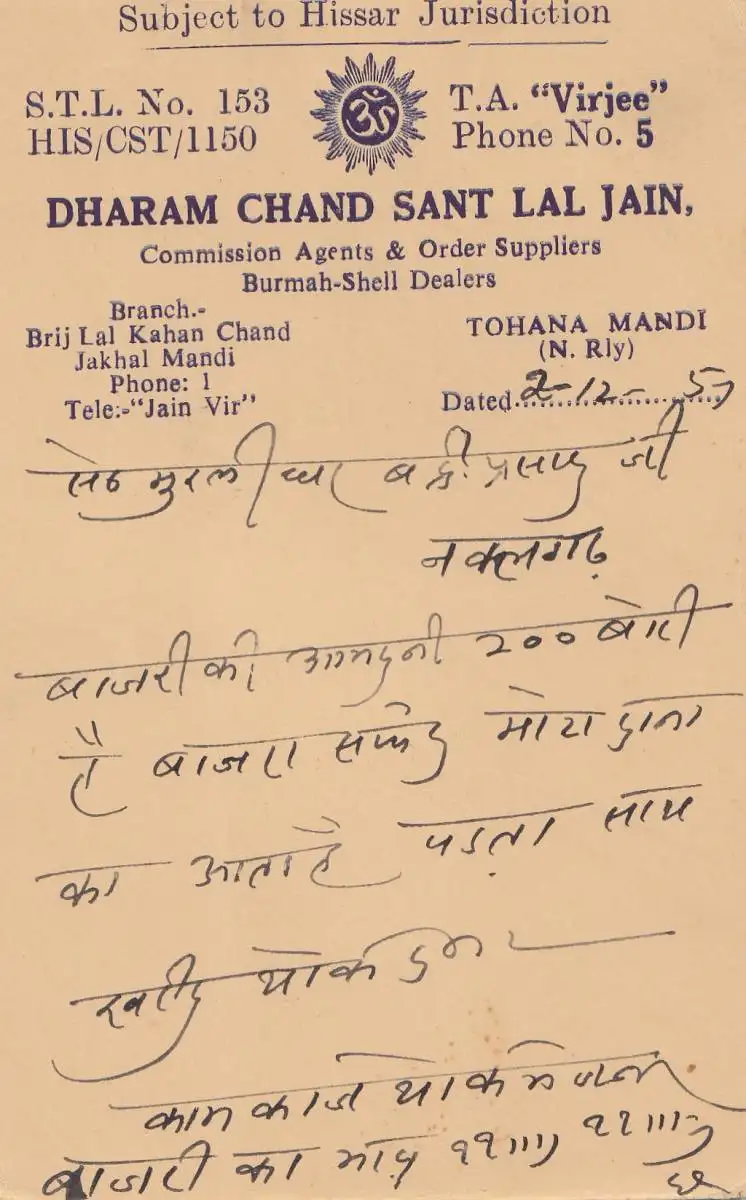 India 1951: post card Tohana Mandi to Nawalgh