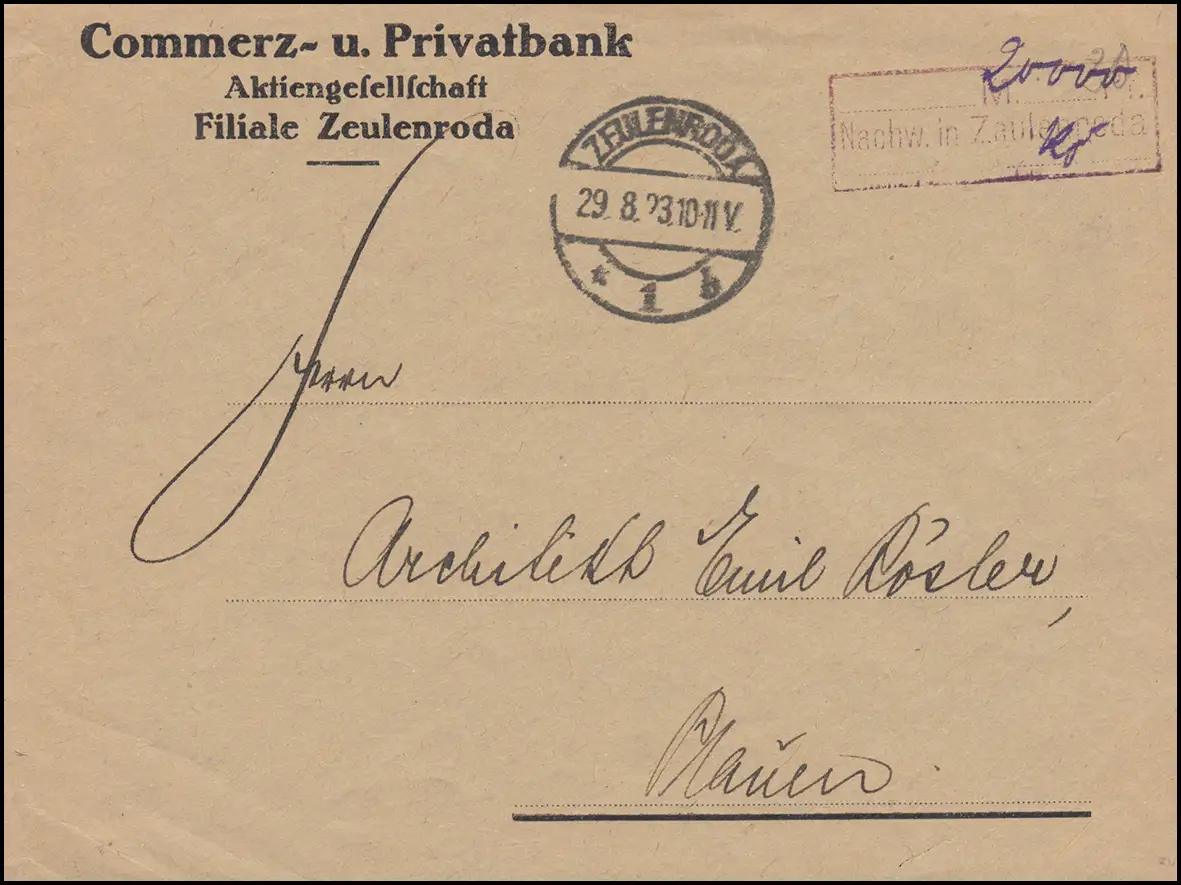 Avant-poste d'une lettre de portogrechte antérieure dans le transport à longue distance - Manuscrit 20000 (Mark) - la banque Commerz- und Privatbank AG filiale Zeulenroda après Plauen Examen: original Référence produit: 00000000030186>Note: Cet article n'est disponible qu' une seule fois. Vous recevrez exactement l'article représenté.