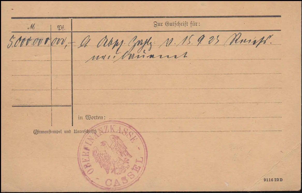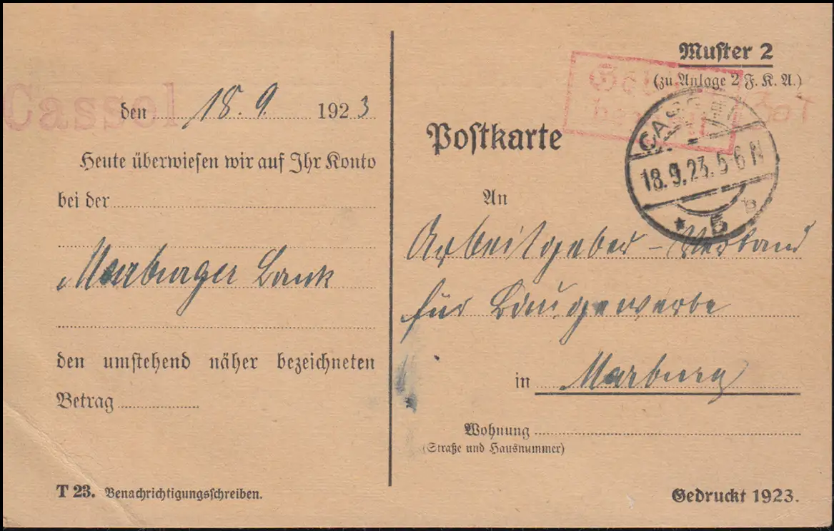 Infla-Expédition d'urgence Temple payant sur carte postale CASSEL 18.9.23