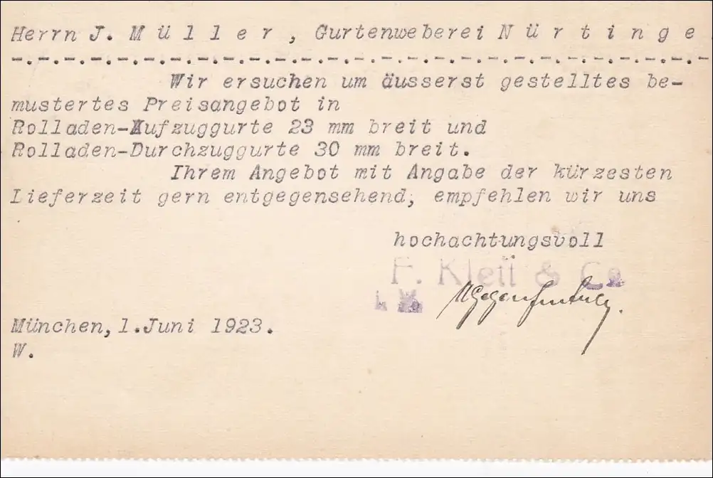 Infla: Carte postale de Munich à Nürtingen 1923 - Sonnerieweberei