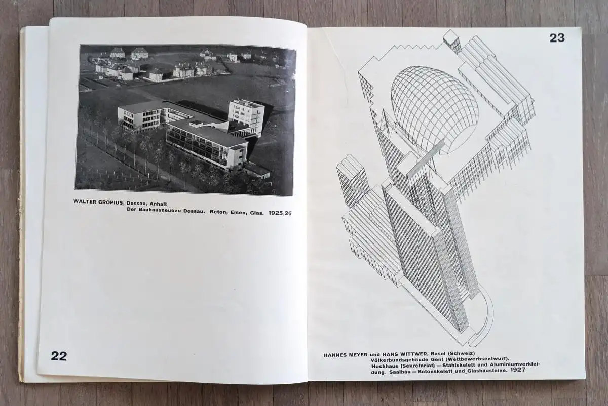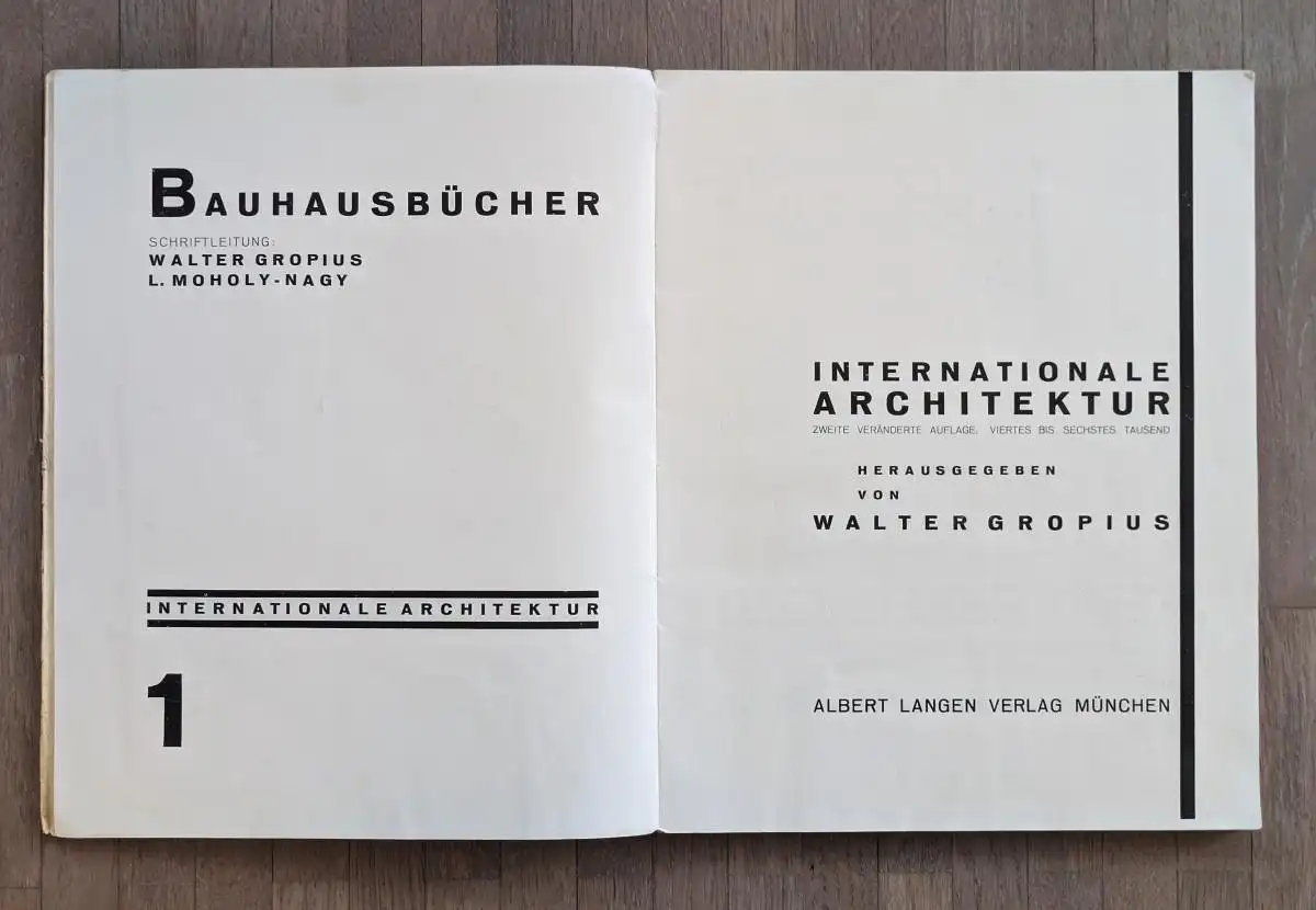 Der erste Titel der legendären Bauhausbücher Reihe, herausgegeben von Gropius, der auf mehr als 100 meist ganzseitigen Abbildungen die gesamte Avantgarde der zeitgenössisch modernen Architektur vorstellt: Peter Behrens, Marcel Breuer, Le Corbusier, Theo van Doesburg, Walter Gropius, Adolf Loos, Erich Mendelsohn, Mies van der Rohe, Farkas Molnar, Georg Muche, J. J. P. Oud, Hans Poelzig, Bruno Taut, Henry van de Velde, Frank Lloyd Wright u. a..