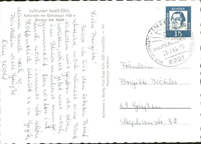 Inzell Luftkurort Kohleralm Inzell postalisch gelaufen 1964 Erhaltung siehe scans Alte Ansichtskarte Postkarte Stefaufe