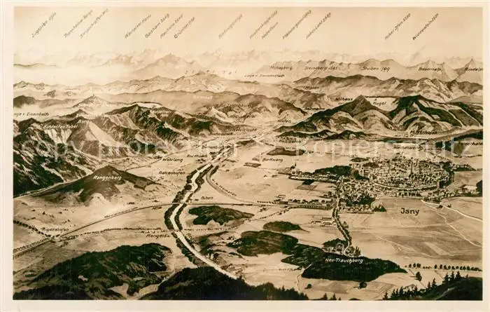 Isny_Allgaeu und Umgebung Alpenpanorama aus der Vogelperspektive Bromsilber Isny Allgaeu postalisch nicht gelaufen 1921-1965 Reliefkarte Erhaltung siehe scans [FriedD77] Reliefkarte Frierer