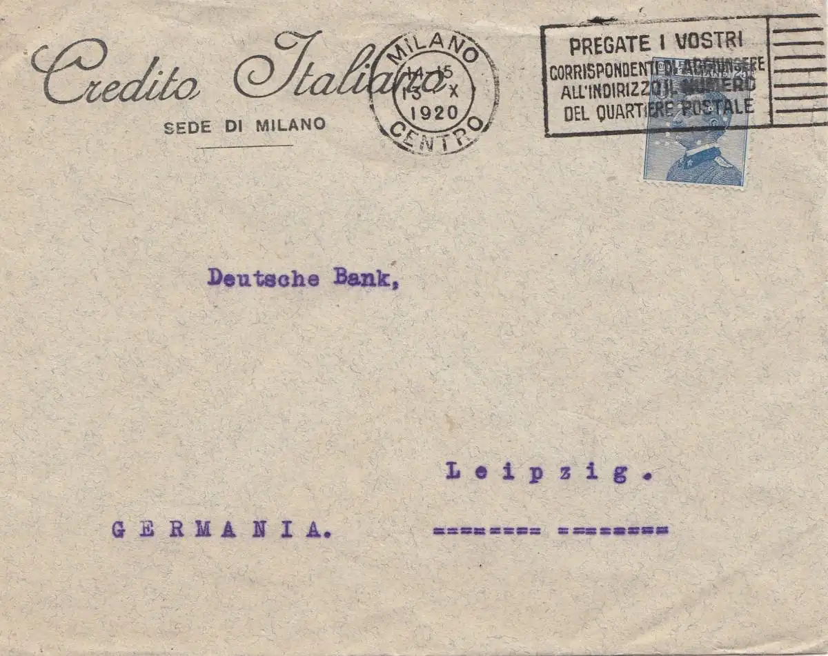 Italie: 1920: Credito Italiano Milano vers Leipzig - Perfin