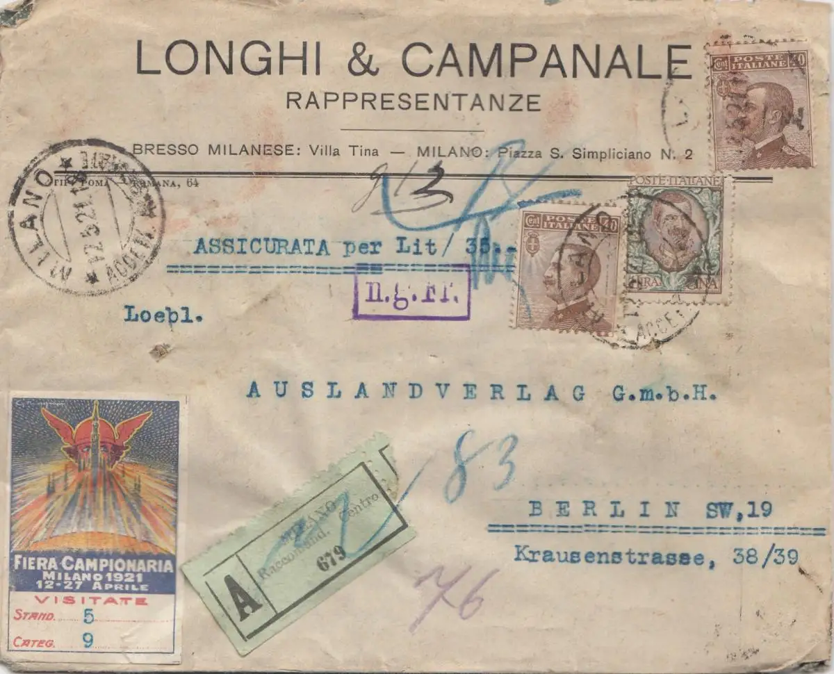 Italie: 1921: recommandé Milan à Berlin: Fiera Campionaria