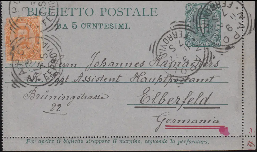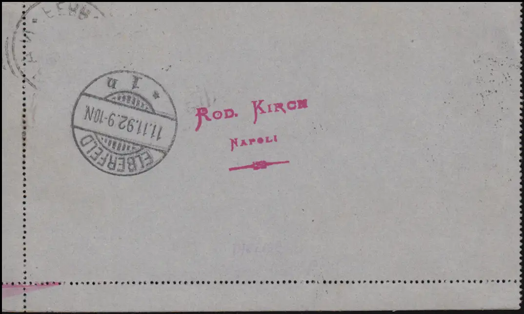 Italie Lettre de carte K 4 avec la fonction complémentaire NAPOLI 9.11.1892 n. ELBERFELD 11.11.