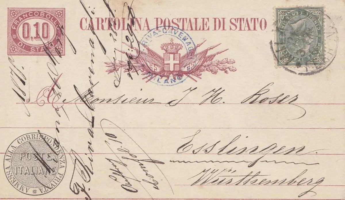 Italie: 1878: Cartolina Postale die Stato a Esslingen