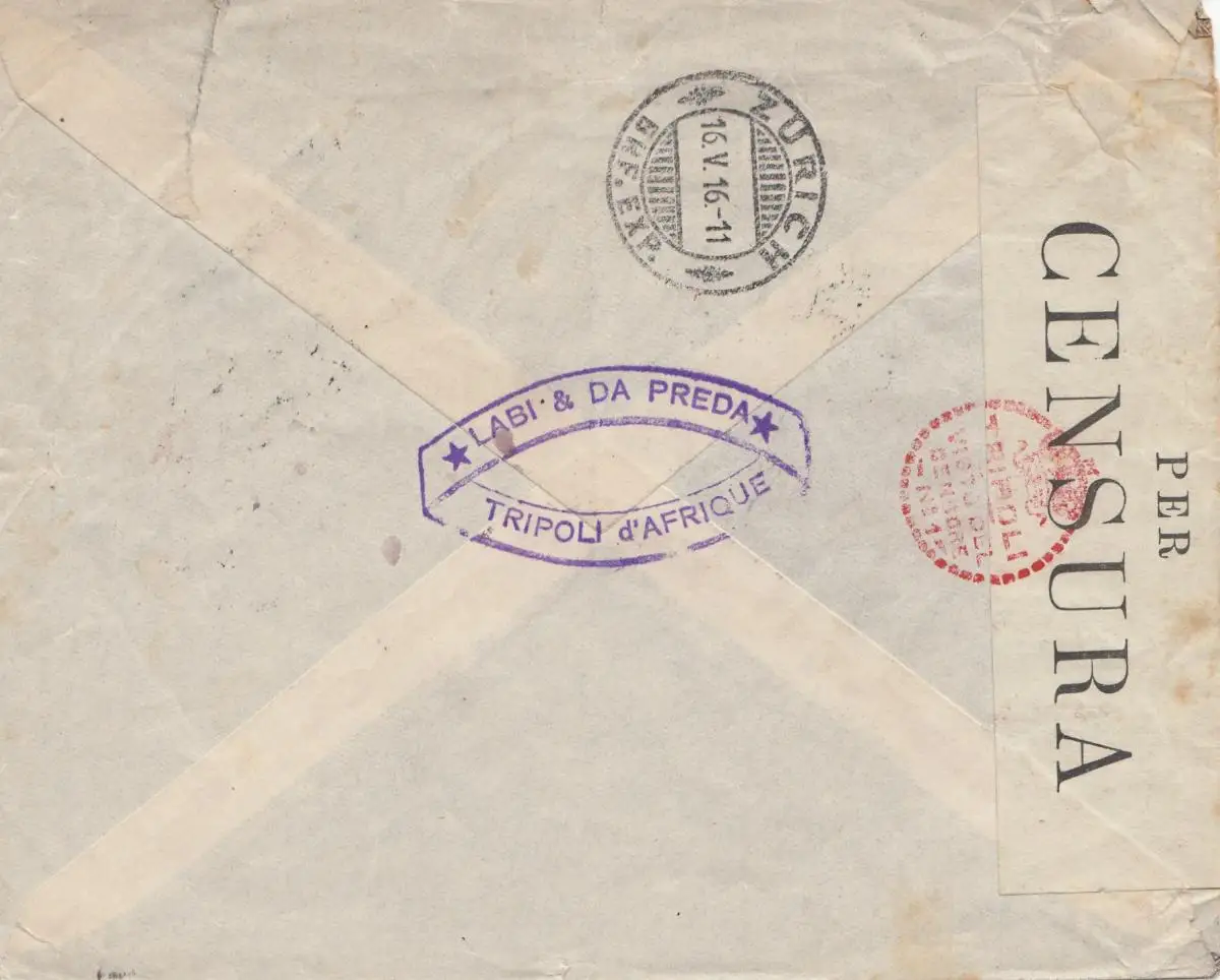 Italie: 1916: Tripoli vers Zurich / Suisse - censure