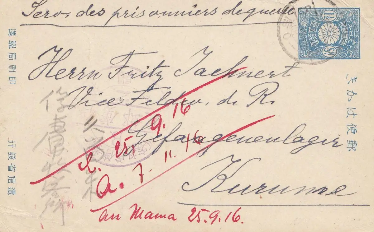 Japon: 1916: post card - prisner of war - to Kurume
