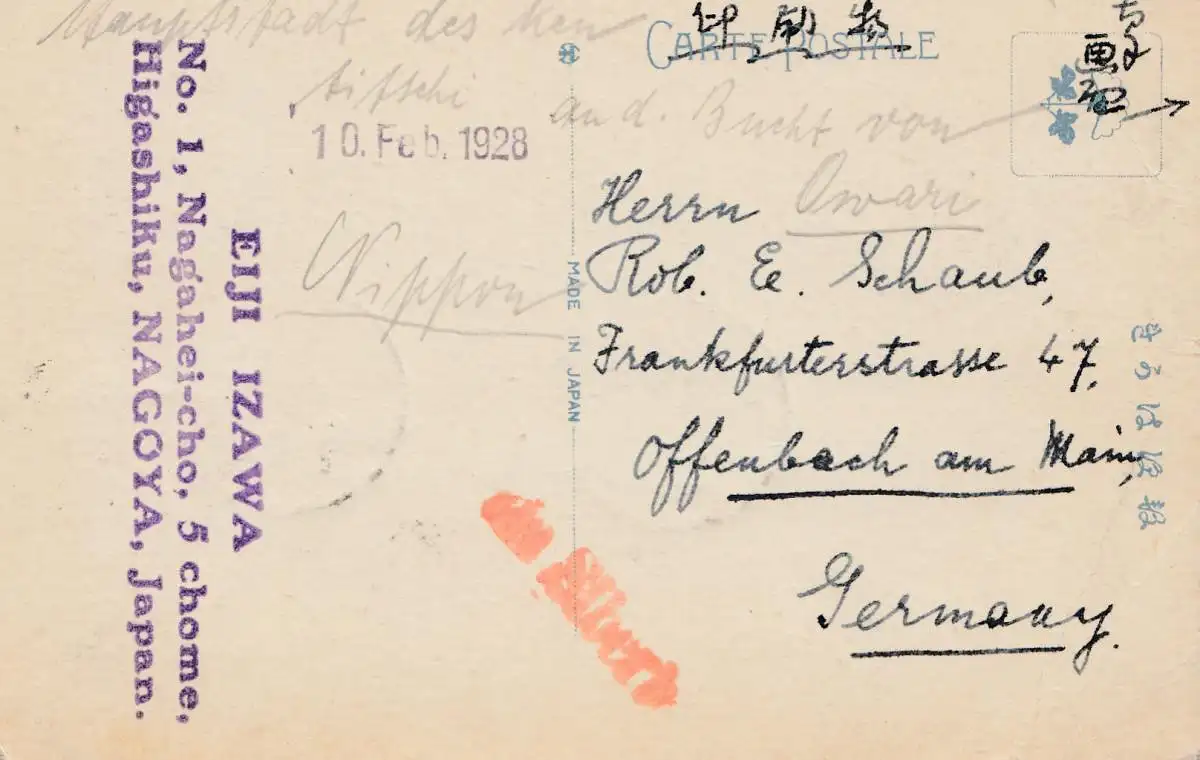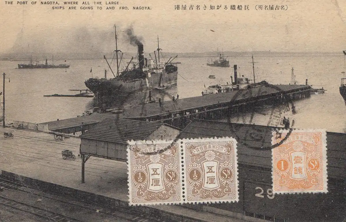 Japon 1928: post card Nagoya, harbor, to Offenbach