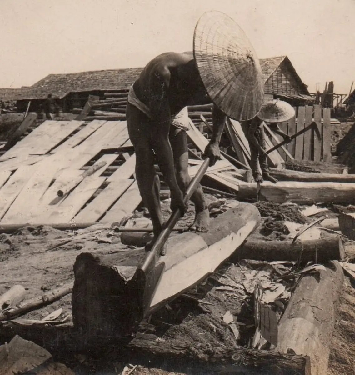 Caption in English: In a Japanese lumber yard, hewing timber.