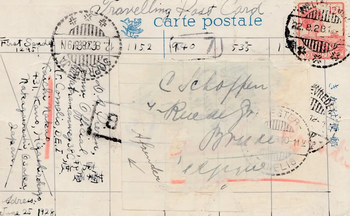Japon 1928 travelling post card Kagawaken to Philadelphie to Holland to Brussels
