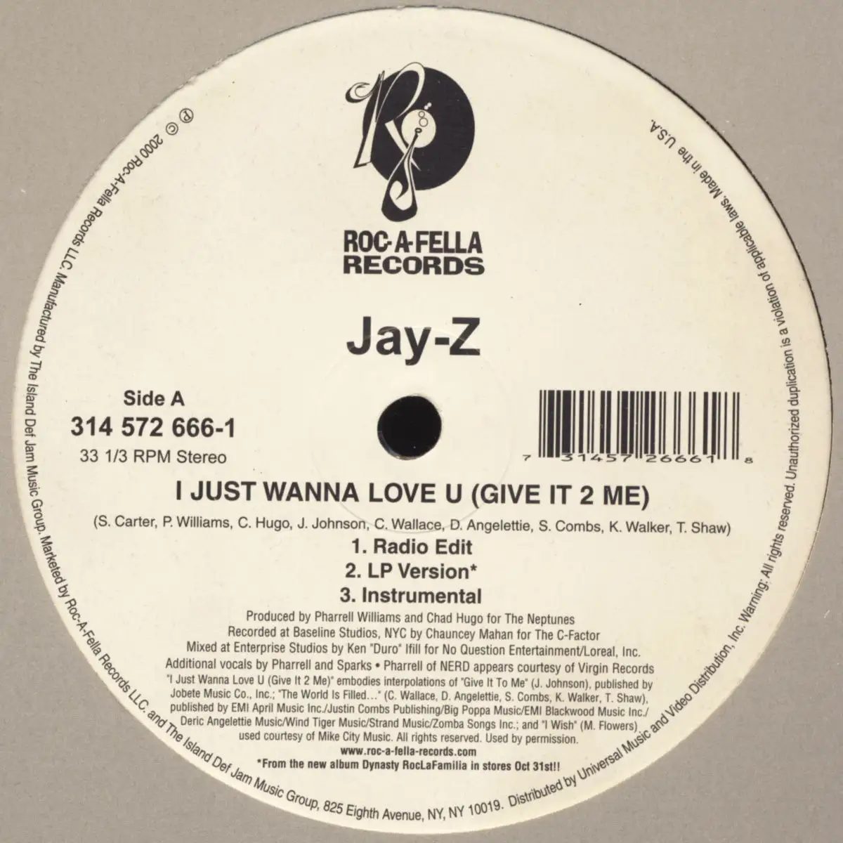 12" Maxi Jay-Z - I Just Wanna Love U Give It 2 Me, Recover unitaire de la société de disques, État VG+ Housse VD+; Fabriqué dans United States 2000 Roc-A-Fella 314 572 666-1, Tracks [Radio Edit], [LP Version], parking Lot Pimpin' [Reproduction Radio Edite], Parking lot Pimpin&& #039], Parc Lot [La version LP], Parking Lot Pimpin &# 039;[Instrumental]