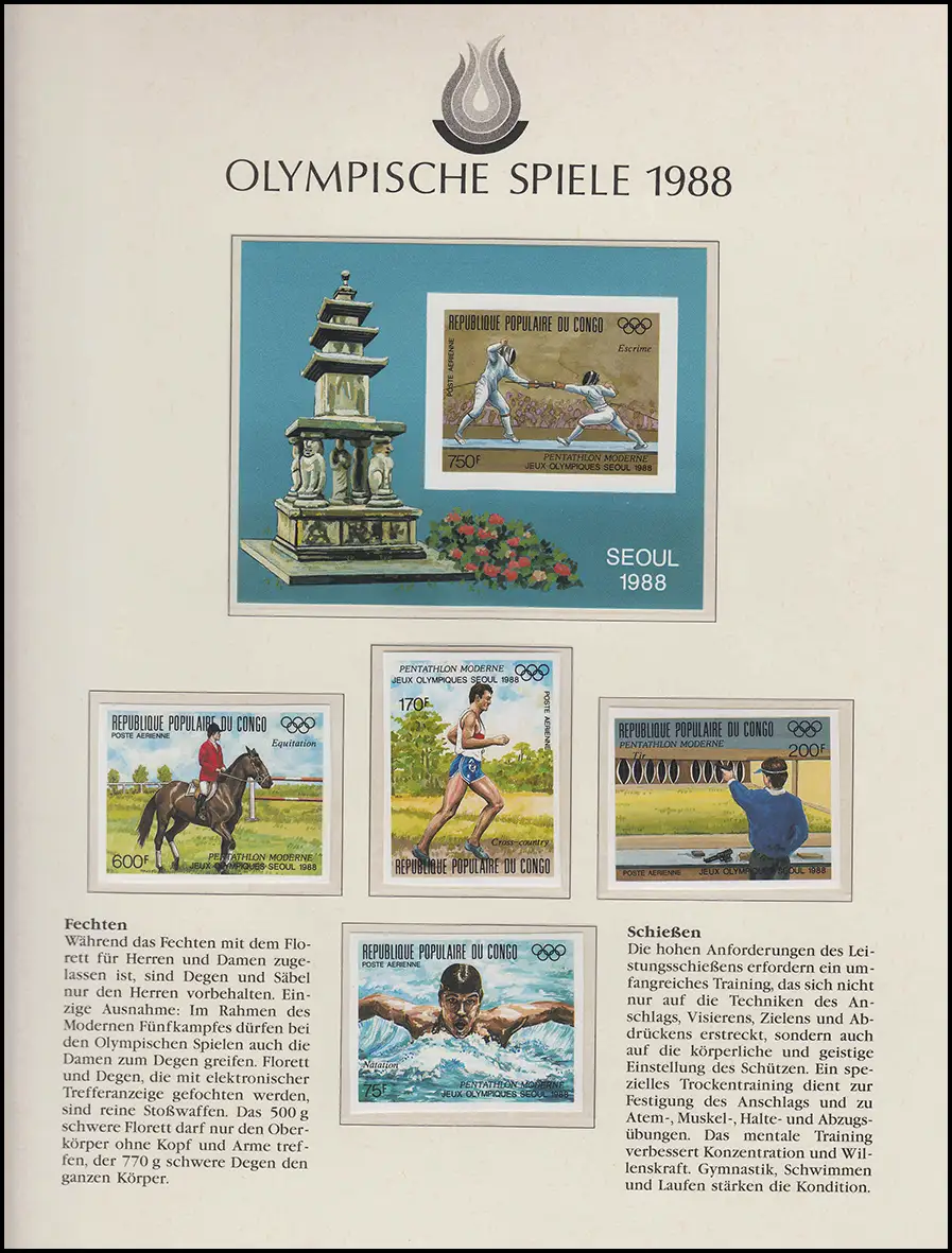 Jeux olympiques 1988 Séoul - Congo, 1 x bloc + ensemble non-denté, sports **