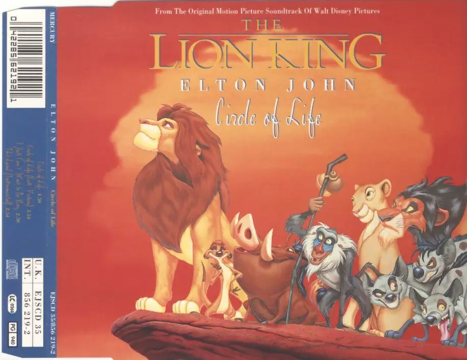 CD Single Elton John - Circle Of Life, from the Soundtrack ' The Lion King' insert incomplete, état CD VG+ Hülle G; Made in Germany 1994 Mercury 856 219-2, Tracks Barrle of Live Lon Kin 4:50, Twillie, Carmen - Carcle Op Lif [Cast Vers.] 3:54, Weaver, Jason - I Just Can&& #039,t Wait To Be Kying 2:50; Zimmer, Hans - This Land [Instr. 2:54]