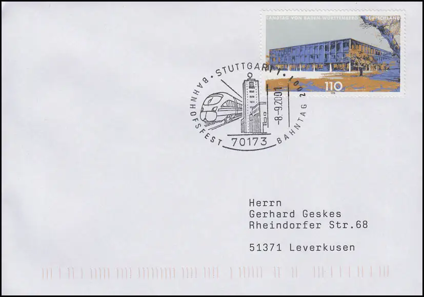 Journée ferroviaire Stuttgart 2001 & ICE et gare ferroviaire, lettre SSt Stuttgart 8.9.2001