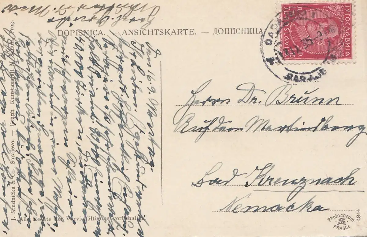 Yougoslavie: 1935: Carte de visite Sarajevo après Bad Kreuznach