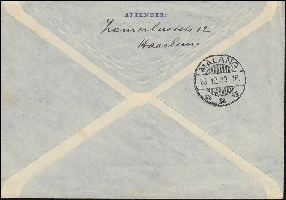 Poste KLM Postjager/Pélikaan Amsterdam-Malang 9.12.33, à partir de HAARLEM 7.12.32