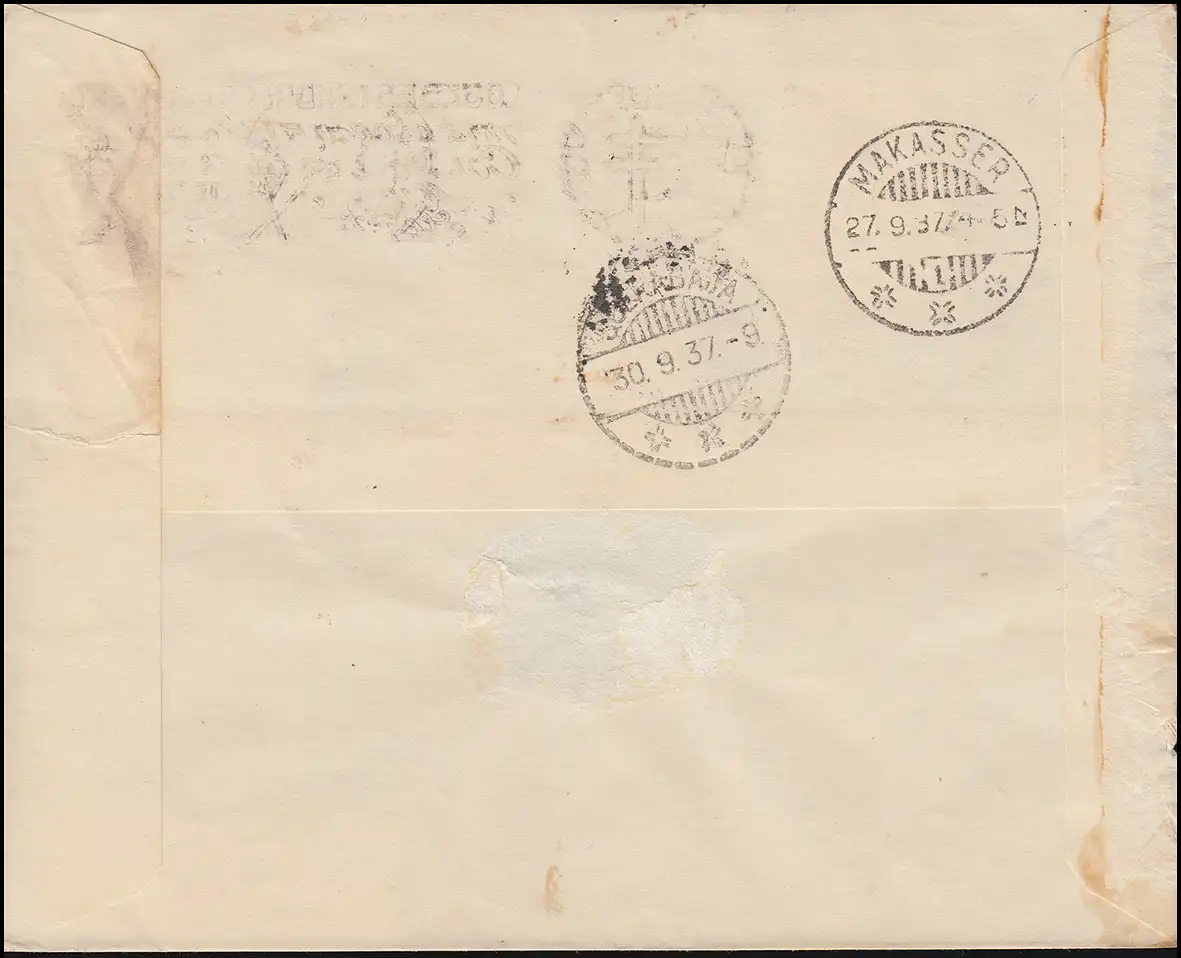 KNIM Premier vol Soerabaja-Makaster 27.9.1937 Lettre SOLABAJA AARMARKI 27.7.37