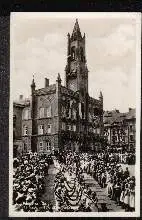 Kamenz in Sa. Rathaus mit Forstfestauszug - Gelaufen 1938. Waidemar Besser, Kamenz i. Sa., Schulplatz 2 Nr. 104. (NPLZ 01917, Försterei, Strassenzug, Propaganda, Patriotika, Nationalsymbole).