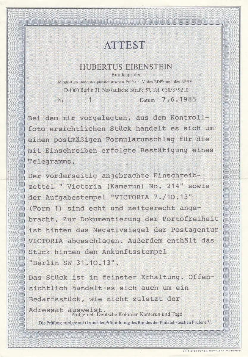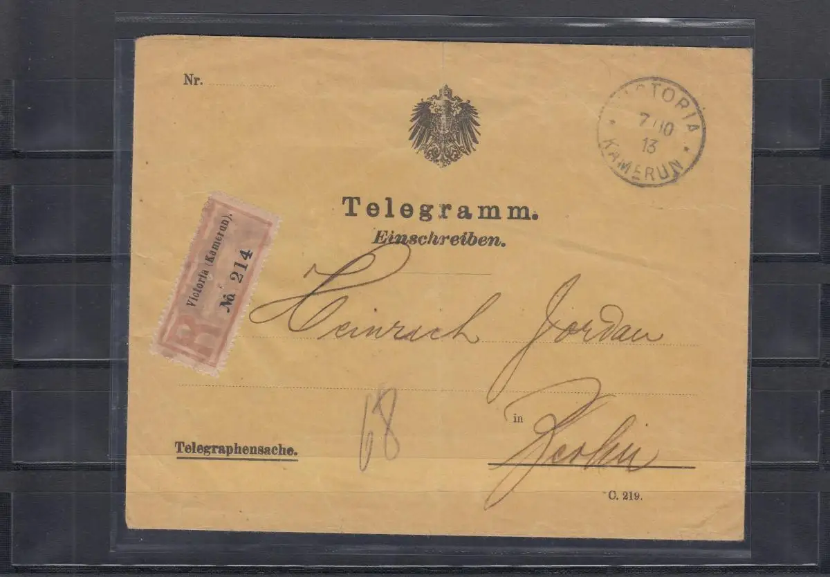 Cameroun 1913: Télégramme recommandé Victoria - Tampon négatif après Berlin, BPP
