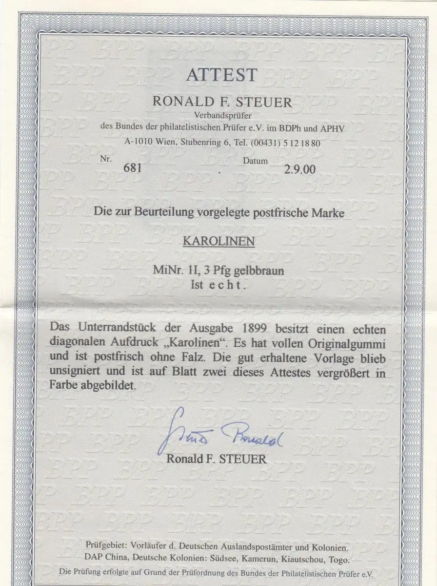 Carolines: MiNr. 1 I, post-fraîchissement, BPP Attest