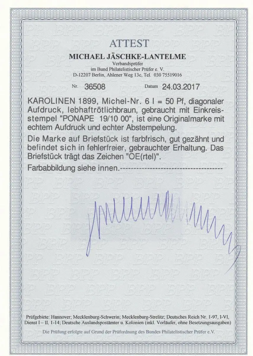 Carolines: Min. 6 I, , cacheté, BPP Attest