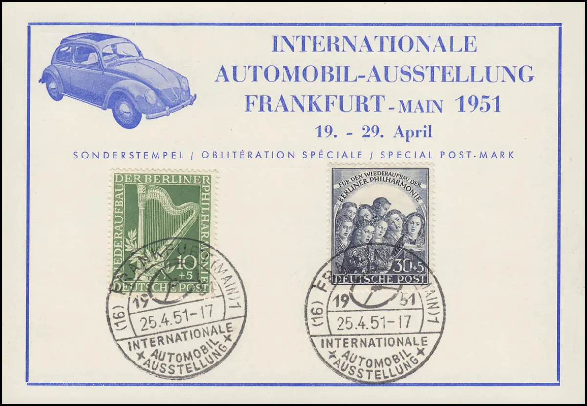 Karte Automobilausstellung mit 72-73 Philharmonie, SSt Frankfurt Lenkrad 25.4.51