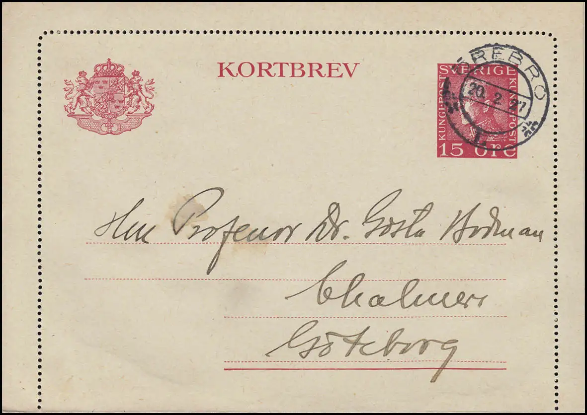 Carte postale K 27IW KORTBREV 15 Öre, OREBRO 20.2.1927 vers Göteborg