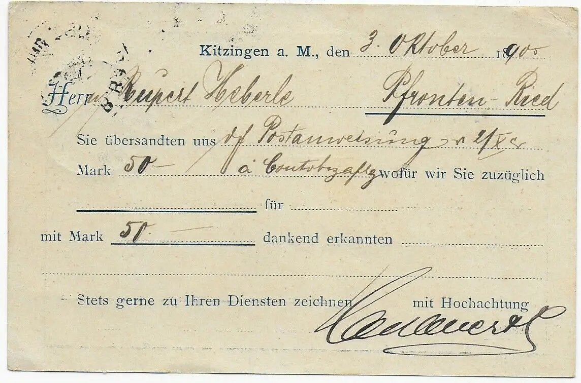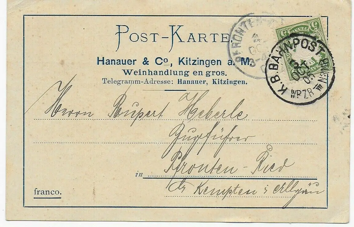 Kitzingen, 1905 vers Pfronten, poste ferroviaire au chef de train, carte de l'entreprise