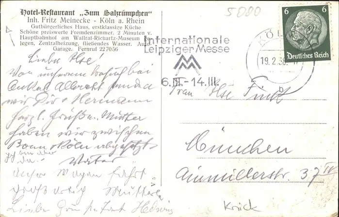 Koeln Hotel Restaurant zum Salzruempchen Koeln postalisch gelaufen 1938 Erhaltung mit Maengel Alte Ansichtskarte Postkarte hz Lmann