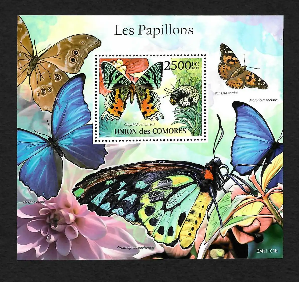 Comores: Les Papillons, la flore et la faune Minéraux 2011, bloc frais **