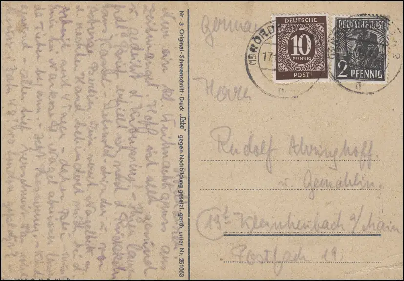Conseil de contrôle I+II Carte de Noël de NORDHAUSEN 17.12.47 à Kleinheubach