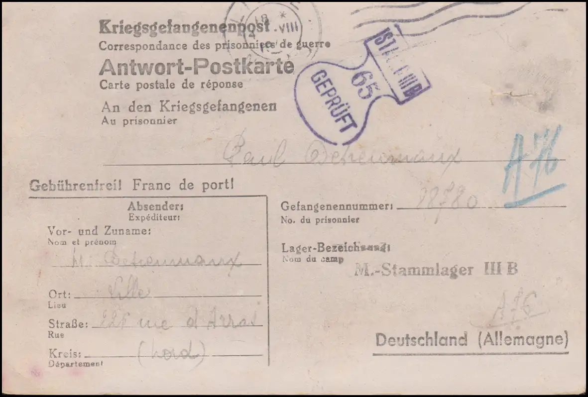 Poste de prisonniers de guerre Réponse-PC à Stalag III B de Lille / France 4.8.1944