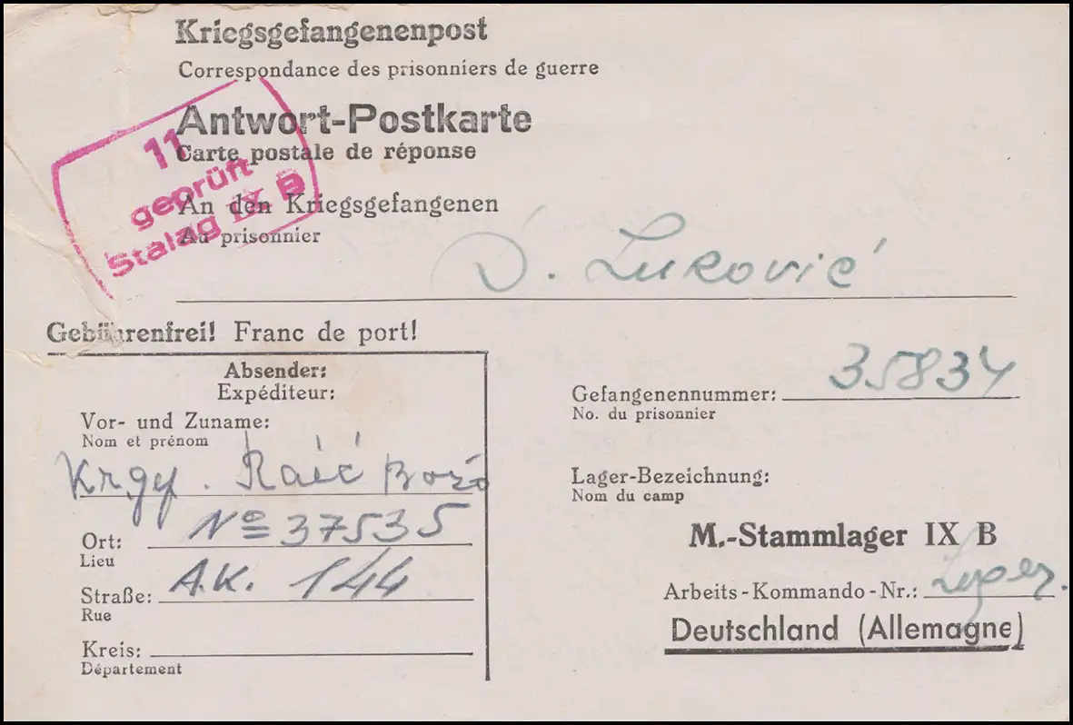 Poste de prisonniers de guerre Réponse-PK à Stalag IX B de France