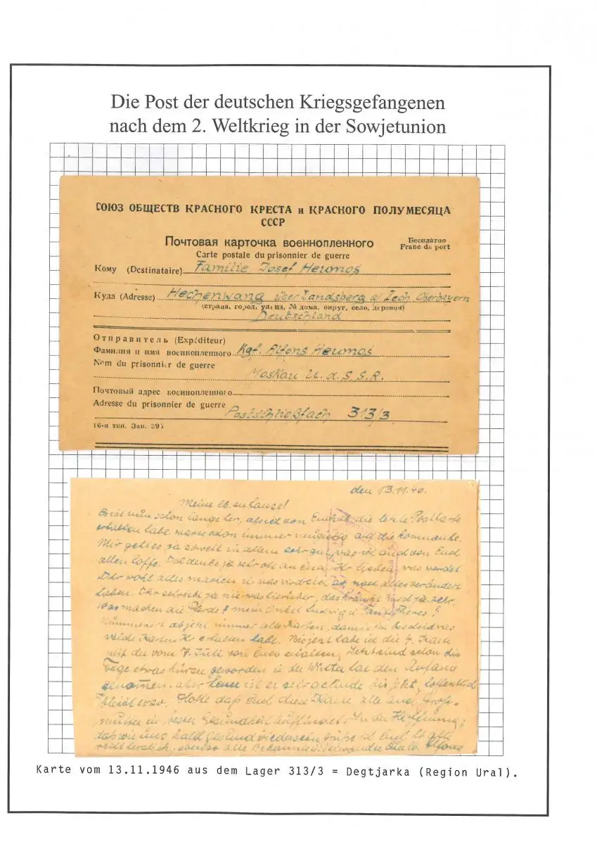 Post de prisonniers de guerre Degtiarsk de camp 313/3 URSS vers Hechenwang 13.11.1946