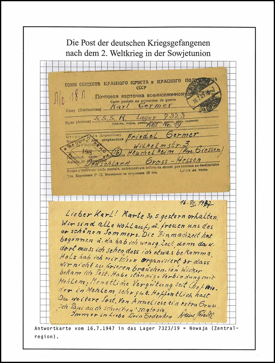 Poste de prisonniers de guerre Carte vers le camp 7323/19 Tula URSS, Heuchelheim 16.7.1947