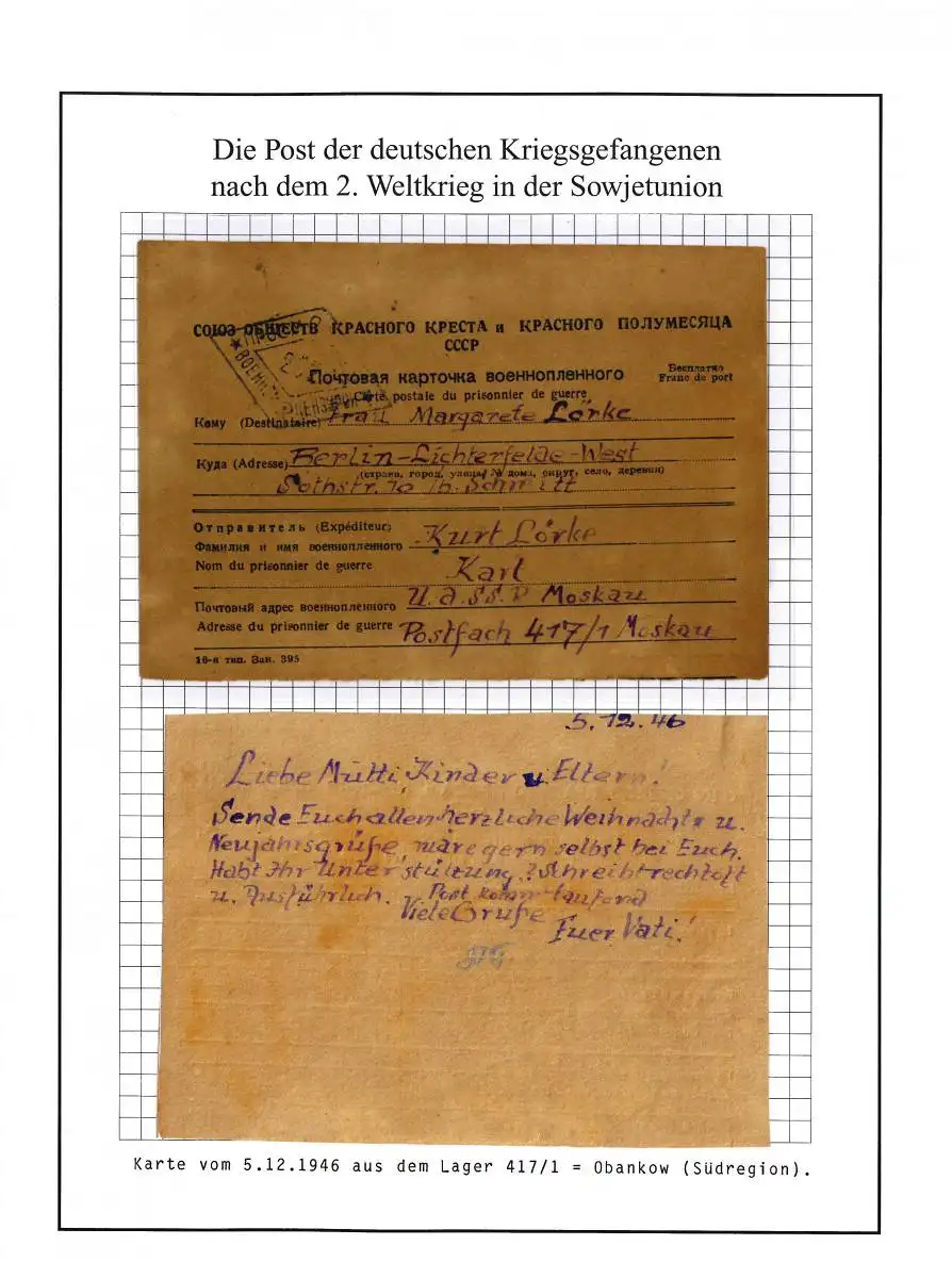 Poste de prisonniers de guerre camp 417/1 Dnepropetrovsk URSS vers Berlin du 5.12.1946