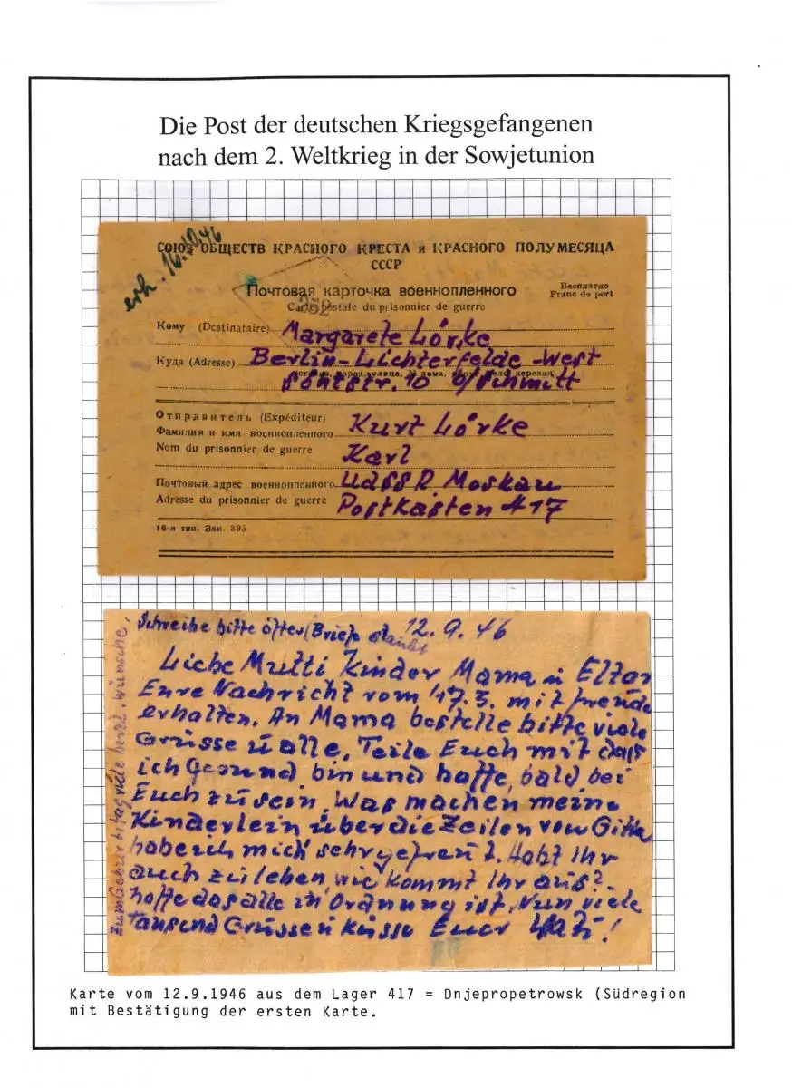 Poste de prisonniers de guerre camp 417 Dnepropetrovsk URSS à Berlin du 12.9.1946