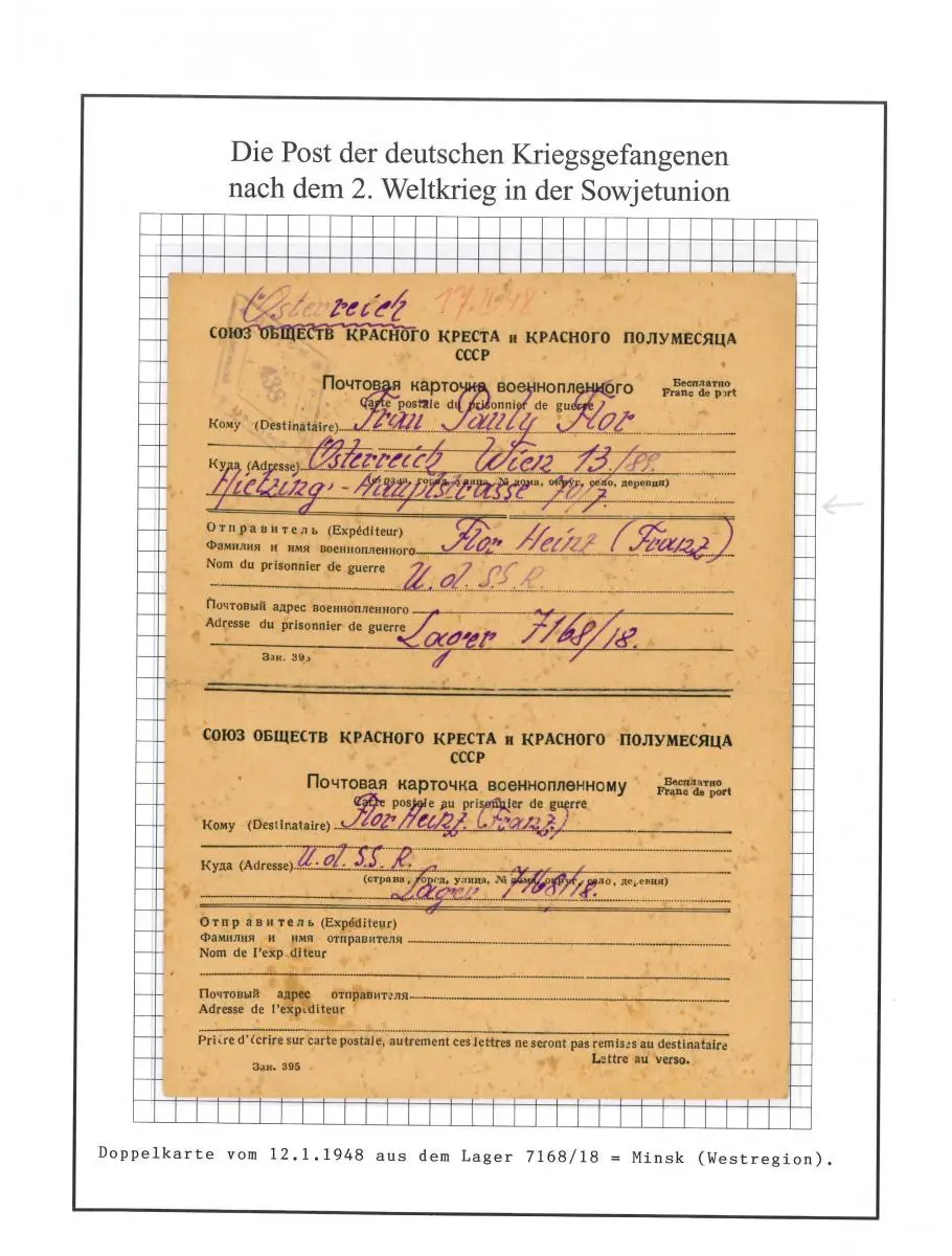 Poste de prisonniers de guerre Camp 7168 /18 Minsk URSS vers Autriche Vienne 12.1.1948