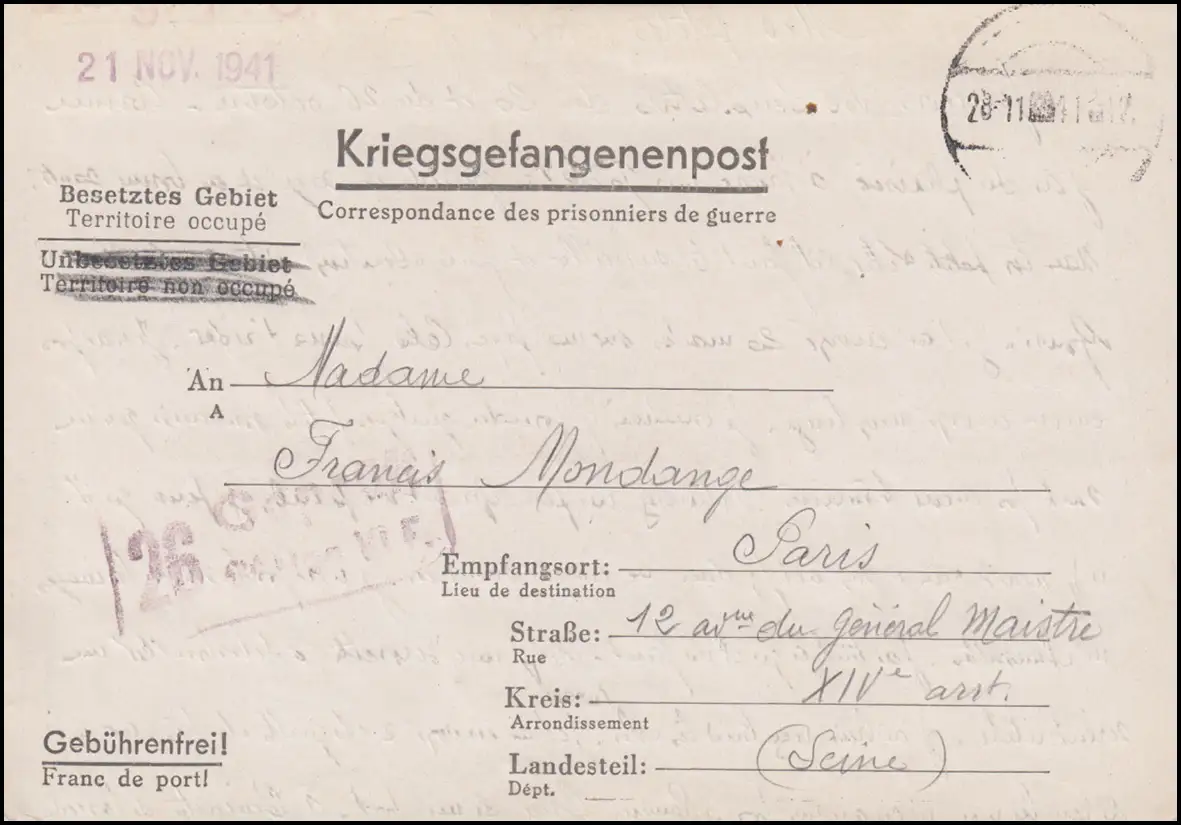 Poste de prisonniers de guerre Stalag VI F Bocholt/Westf., timbre-cadran 28.11.41 à Paris