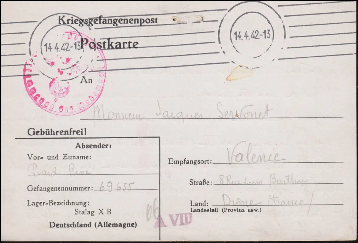 Poste de prisonniers de guerre Stalag X B / A VIII Tampon de camouflage 14.4.42 à Valence/Frank.