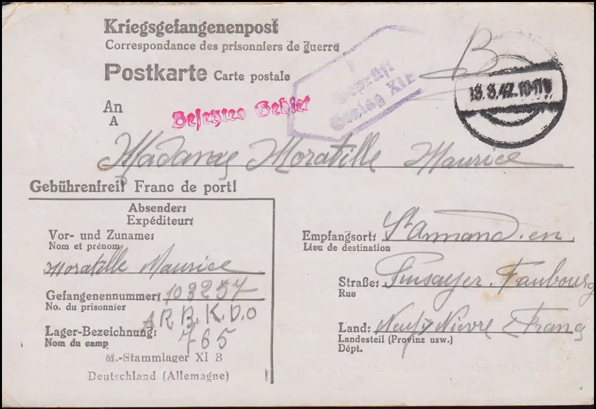 Poste de prisonniers de guerre Stalag XI B, timbre-cadran 18.8.1942, vers la France
